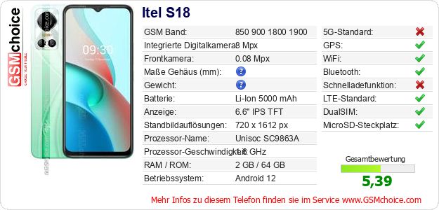 Hast du eigene Webseite? Willst du die Informationen über Standarddaten des Handys Itel S18 irgendwo veröffentlichen? Das ist sehr einfach. Du kannst das Bild herunterladen oder kopieren und auf der Webseite folgenden Code hinzufügen:Das Einfügen von diesem Code verursacht das Anzeigen von dem folgenden Bild: