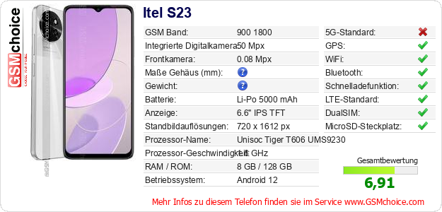 Hast du eigene Webseite? Willst du die Informationen über Standarddaten des Handys Itel S23 irgendwo veröffentlichen? Das ist sehr einfach. Du kannst das Bild herunterladen oder kopieren und auf der Webseite folgenden Code hinzufügen:Das Einfügen von diesem Code verursacht das Anzeigen von dem folgenden Bild: