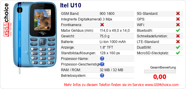 Hast du eigene Webseite? Willst du die Informationen über Standarddaten des Handys Itel U10 irgendwo veröffentlichen? Das ist sehr einfach. Du kannst das Bild herunterladen oder kopieren und auf der Webseite folgenden Code hinzufügen:Das Einfügen von diesem Code verursacht das Anzeigen von dem folgenden Bild: