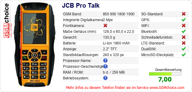 Hast du eigene Webseite? Willst du die Informationen über Standarddaten des Handys JCB Pro Talk irgendwo veröffentlichen? Das ist sehr einfach. Du kannst das Bild herunterladen oder kopieren und auf der Webseite folgenden Code hinzufügen:Das Einfügen von diesem Code verursacht das Anzeigen von dem folgenden Bild: