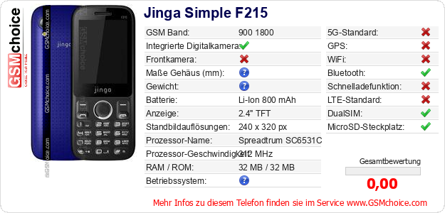 Hast du eigene Webseite? Willst du die Informationen über Standarddaten des Handys Jinga Simple F215 irgendwo veröffentlichen? Das ist sehr einfach. Du kannst das Bild herunterladen oder kopieren und auf der Webseite folgenden Code hinzufügen:Das Einfügen von diesem Code verursacht das Anzeigen von dem folgenden Bild: