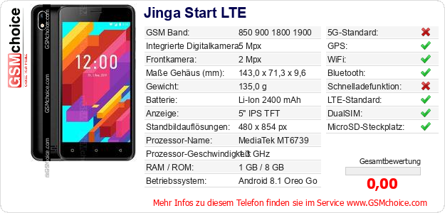 Hast du eigene Webseite? Willst du die Informationen über Standarddaten des Handys Jinga Start LTE irgendwo veröffentlichen? Das ist sehr einfach. Du kannst das Bild herunterladen oder kopieren und auf der Webseite folgenden Code hinzufügen:Das Einfügen von diesem Code verursacht das Anzeigen von dem folgenden Bild: