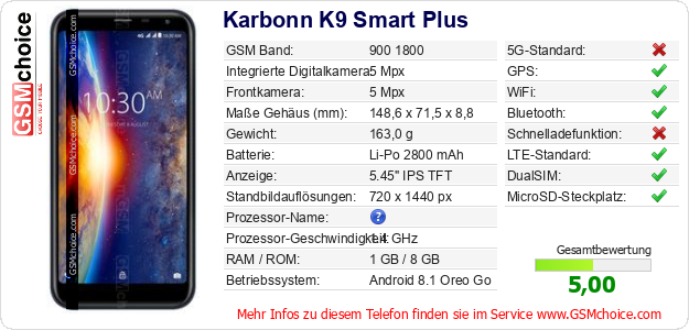 Hast du eigene Webseite? Willst du die Informationen über Standarddaten des Handys Karbonn K9 Smart Plus irgendwo veröffentlichen? Das ist sehr einfach. Du kannst das Bild herunterladen oder kopieren und auf der Webseite folgenden Code hinzufügen:Das Einfügen von diesem Code verursacht das Anzeigen von dem folgenden Bild: