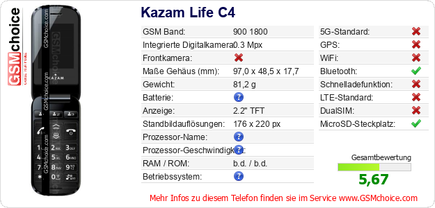 Hast du eigene Webseite? Willst du die Informationen über Standarddaten des Handys Kazam Life C4 irgendwo veröffentlichen? Das ist sehr einfach. Du kannst das Bild herunterladen oder kopieren und auf der Webseite folgenden Code hinzufügen:Das Einfügen von diesem Code verursacht das Anzeigen von dem folgenden Bild:
