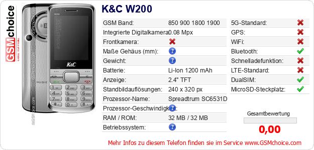 Hast du eigene Webseite? Willst du die Informationen über Standarddaten des Handys K&C W200 irgendwo veröffentlichen? Das ist sehr einfach. Du kannst das Bild herunterladen oder kopieren und auf der Webseite folgenden Code hinzufügen:Das Einfügen von diesem Code verursacht das Anzeigen von dem folgenden Bild: