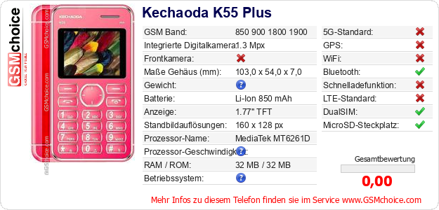Hast du eigene Webseite? Willst du die Informationen über Standarddaten des Handys Kechaoda K55 Plus irgendwo veröffentlichen? Das ist sehr einfach. Du kannst das Bild herunterladen oder kopieren und auf der Webseite folgenden Code hinzufügen:Das Einfügen von diesem Code verursacht das Anzeigen von dem folgenden Bild: