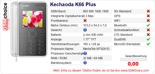 Hast du eigene Webseite? Willst du die Informationen über Standarddaten des Handys Kechaoda K66 Plus irgendwo veröffentlichen? Das ist sehr einfach. Du kannst das Bild herunterladen oder kopieren und auf der Webseite folgenden Code hinzufügen:Das Einfügen von diesem Code verursacht das Anzeigen von dem folgenden Bild: