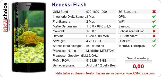 Hast du eigene Webseite? Willst du die Informationen über Standarddaten des Handys Keneksi Flash irgendwo veröffentlichen? Das ist sehr einfach. Du kannst das Bild herunterladen oder kopieren und auf der Webseite folgenden Code hinzufügen:Das Einfügen von diesem Code verursacht das Anzeigen von dem folgenden Bild: