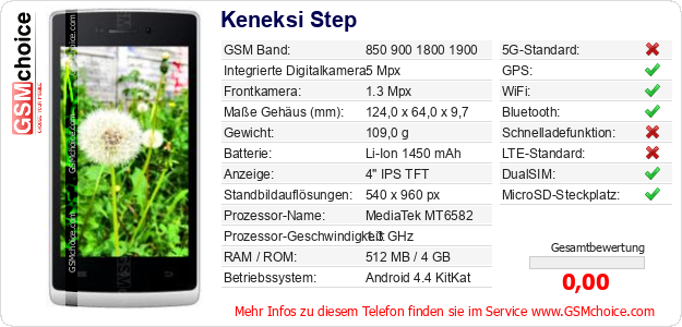 Hast du eigene Webseite? Willst du die Informationen über Standarddaten des Handys Keneksi Step irgendwo veröffentlichen? Das ist sehr einfach. Du kannst das Bild herunterladen oder kopieren und auf der Webseite folgenden Code hinzufügen:Das Einfügen von diesem Code verursacht das Anzeigen von dem folgenden Bild: