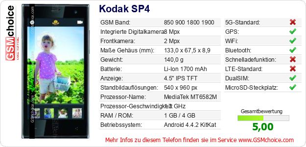 Hast du eigene Webseite? Willst du die Informationen über Standarddaten des Handys Kodak SP4 irgendwo veröffentlichen? Das ist sehr einfach. Du kannst das Bild herunterladen oder kopieren und auf der Webseite folgenden Code hinzufügen:Das Einfügen von diesem Code verursacht das Anzeigen von dem folgenden Bild: