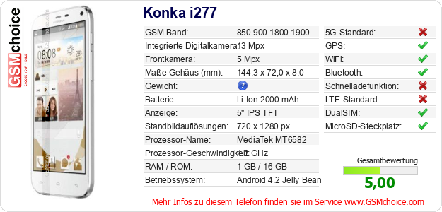 Hast du eigene Webseite? Willst du die Informationen über Standarddaten des Handys Konka i277 irgendwo veröffentlichen? Das ist sehr einfach. Du kannst das Bild herunterladen oder kopieren und auf der Webseite folgenden Code hinzufügen:Das Einfügen von diesem Code verursacht das Anzeigen von dem folgenden Bild: