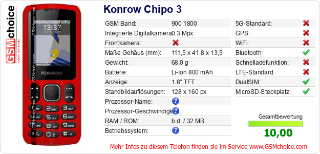 Hast du eigene Webseite? Willst du die Informationen über Standarddaten des Handys Konrow Chipo 3 irgendwo veröffentlichen? Das ist sehr einfach. Du kannst das Bild herunterladen oder kopieren und auf der Webseite folgenden Code hinzufügen:Das Einfügen von diesem Code verursacht das Anzeigen von dem folgenden Bild: