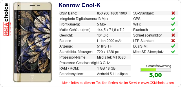 Hast du eigene Webseite? Willst du die Informationen über Standarddaten des Handys Konrow Cool-K irgendwo veröffentlichen? Das ist sehr einfach. Du kannst das Bild herunterladen oder kopieren und auf der Webseite folgenden Code hinzufügen:Das Einfügen von diesem Code verursacht das Anzeigen von dem folgenden Bild:
