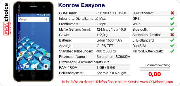 Hast du eigene Webseite? Willst du die Informationen über Standarddaten des Handys Konrow Easyone irgendwo veröffentlichen? Das ist sehr einfach. Du kannst das Bild herunterladen oder kopieren und auf der Webseite folgenden Code hinzufügen:Das Einfügen von diesem Code verursacht das Anzeigen von dem folgenden Bild: