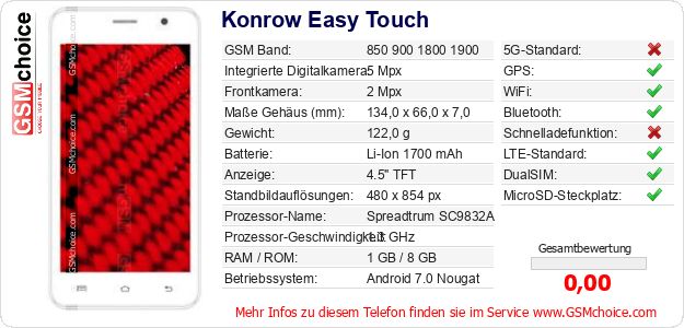 Hast du eigene Webseite? Willst du die Informationen über Standarddaten des Handys Konrow Easy Touch irgendwo veröffentlichen? Das ist sehr einfach. Du kannst das Bild herunterladen oder kopieren und auf der Webseite folgenden Code hinzufügen:Das Einfügen von diesem Code verursacht das Anzeigen von dem folgenden Bild: