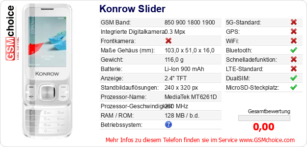 Hast du eigene Webseite? Willst du die Informationen über Standarddaten des Handys Konrow Slider irgendwo veröffentlichen? Das ist sehr einfach. Du kannst das Bild herunterladen oder kopieren und auf der Webseite folgenden Code hinzufügen:Das Einfügen von diesem Code verursacht das Anzeigen von dem folgenden Bild: