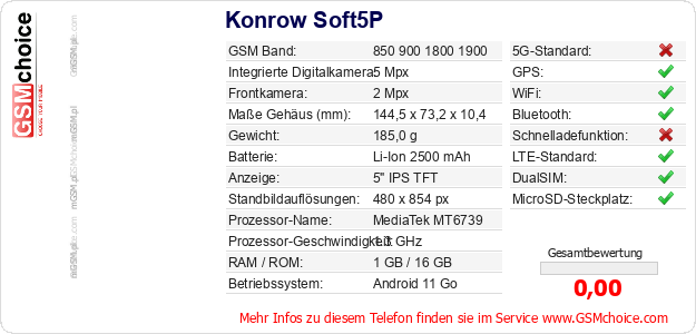Hast du eigene Webseite? Willst du die Informationen über Standarddaten des Handys Konrow Soft5P irgendwo veröffentlichen? Das ist sehr einfach. Du kannst das Bild herunterladen oder kopieren und auf der Webseite folgenden Code hinzufügen:Das Einfügen von diesem Code verursacht das Anzeigen von dem folgenden Bild: