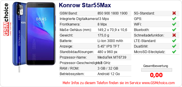 Hast du eigene Webseite? Willst du die Informationen über Standarddaten des Handys Konrow Star55Max irgendwo veröffentlichen? Das ist sehr einfach. Du kannst das Bild herunterladen oder kopieren und auf der Webseite folgenden Code hinzufügen:Das Einfügen von diesem Code verursacht das Anzeigen von dem folgenden Bild: