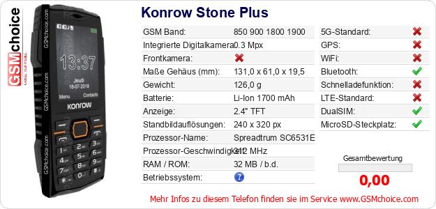 Hast du eigene Webseite? Willst du die Informationen über Standarddaten des Handys Konrow Stone Plus irgendwo veröffentlichen? Das ist sehr einfach. Du kannst das Bild herunterladen oder kopieren und auf der Webseite folgenden Code hinzufügen:Das Einfügen von diesem Code verursacht das Anzeigen von dem folgenden Bild: