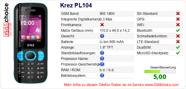 Hast du eigene Webseite? Willst du die Informationen über Standarddaten des Handys Krez PL104 irgendwo veröffentlichen? Das ist sehr einfach. Du kannst das Bild herunterladen oder kopieren und auf der Webseite folgenden Code hinzufügen:Das Einfügen von diesem Code verursacht das Anzeigen von dem folgenden Bild:
