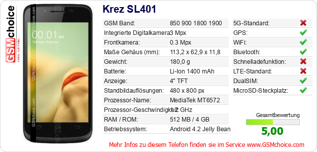 Hast du eigene Webseite? Willst du die Informationen über Standarddaten des Handys Krez SL401 irgendwo veröffentlichen? Das ist sehr einfach. Du kannst das Bild herunterladen oder kopieren und auf der Webseite folgenden Code hinzufügen:Das Einfügen von diesem Code verursacht das Anzeigen von dem folgenden Bild: