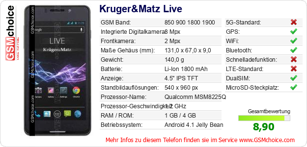 Hast du eigene Webseite? Willst du die Informationen über Standarddaten des Handys Kruger&Matz Live irgendwo veröffentlichen? Das ist sehr einfach. Du kannst das Bild herunterladen oder kopieren und auf der Webseite folgenden Code hinzufügen:Das Einfügen von diesem Code verursacht das Anzeigen von dem folgenden Bild: