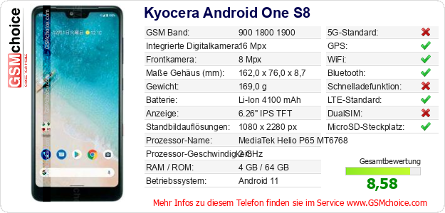 Hast du eigene Webseite? Willst du die Informationen über Standarddaten des Handys Kyocera Android One S8 irgendwo veröffentlichen? Das ist sehr einfach. Du kannst das Bild herunterladen oder kopieren und auf der Webseite folgenden Code hinzufügen:Das Einfügen von diesem Code verursacht das Anzeigen von dem folgenden Bild:
