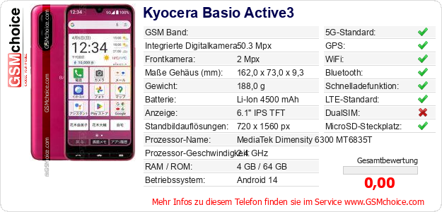 Hast du eigene Webseite? Willst du die Informationen über Standarddaten des Handys Kyocera Basio Active3 irgendwo veröffentlichen? Das ist sehr einfach. Du kannst das Bild herunterladen oder kopieren und auf der Webseite folgenden Code hinzufügen:Das Einfügen von diesem Code verursacht das Anzeigen von dem folgenden Bild: