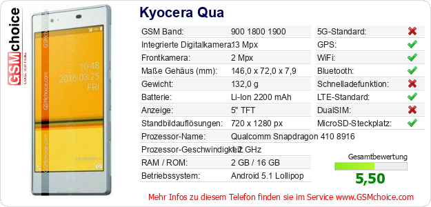 Hast du eigene Webseite? Willst du die Informationen über Standarddaten des Handys Kyocera Qua irgendwo veröffentlichen? Das ist sehr einfach. Du kannst das Bild herunterladen oder kopieren und auf der Webseite folgenden Code hinzufügen:Das Einfügen von diesem Code verursacht das Anzeigen von dem folgenden Bild: