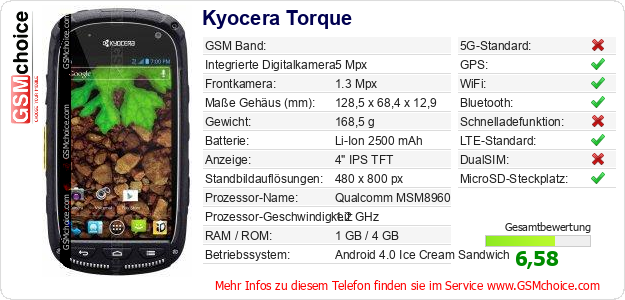 Hast du eigene Webseite? Willst du die Informationen über Standarddaten des Handys Kyocera Torque irgendwo veröffentlichen? Das ist sehr einfach. Du kannst das Bild herunterladen oder kopieren und auf der Webseite folgenden Code hinzufügen:Das Einfügen von diesem Code verursacht das Anzeigen von dem folgenden Bild:
