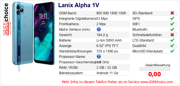 Daten des Mobiltelefons Lanix Alpha 1V auf Ihrer Seite