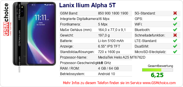 Hast du eigene Webseite? Willst du die Informationen über Standarddaten des Handys Lanix Ilium Alpha 5T irgendwo veröffentlichen? Das ist sehr einfach. Du kannst das Bild herunterladen oder kopieren und auf der Webseite folgenden Code hinzufügen:Das Einfügen von diesem Code verursacht das Anzeigen von dem folgenden Bild:
