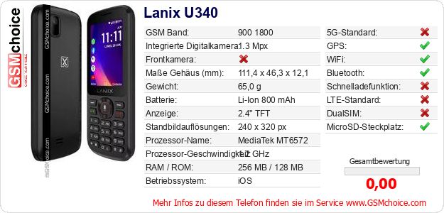 Hast du eigene Webseite? Willst du die Informationen über Standarddaten des Handys Lanix U340 irgendwo veröffentlichen? Das ist sehr einfach. Du kannst das Bild herunterladen oder kopieren und auf der Webseite folgenden Code hinzufügen:Das Einfügen von diesem Code verursacht das Anzeigen von dem folgenden Bild: