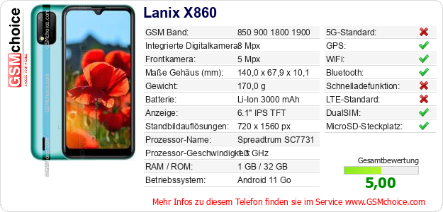 Hast du eigene Webseite? Willst du die Informationen über Standarddaten des Handys Lanix X860 irgendwo veröffentlichen? Das ist sehr einfach. Du kannst das Bild herunterladen oder kopieren und auf der Webseite folgenden Code hinzufügen:Das Einfügen von diesem Code verursacht das Anzeigen von dem folgenden Bild: