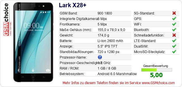 Hast du eigene Webseite? Willst du die Informationen über Standarddaten des Handys Lark X28+ irgendwo veröffentlichen? Das ist sehr einfach. Du kannst das Bild herunterladen oder kopieren und auf der Webseite folgenden Code hinzufügen:Das Einfügen von diesem Code verursacht das Anzeigen von dem folgenden Bild: