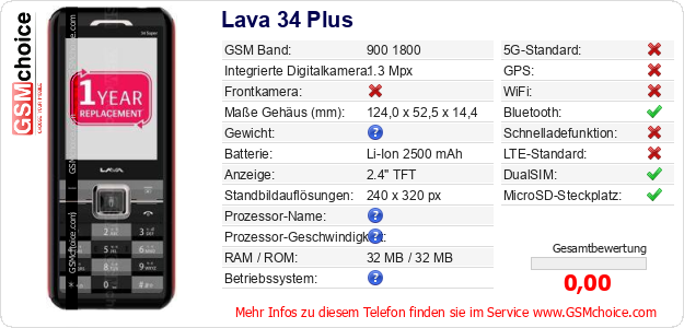 Hast du eigene Webseite? Willst du die Informationen über Standarddaten des Handys Lava 34 Plus irgendwo veröffentlichen? Das ist sehr einfach. Du kannst das Bild herunterladen oder kopieren und auf der Webseite folgenden Code hinzufügen:Das Einfügen von diesem Code verursacht das Anzeigen von dem folgenden Bild: