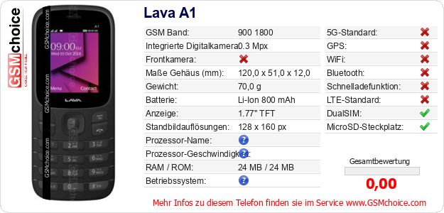 Hast du eigene Webseite? Willst du die Informationen über Standarddaten des Handys Lava A1 irgendwo veröffentlichen? Das ist sehr einfach. Du kannst das Bild herunterladen oder kopieren und auf der Webseite folgenden Code hinzufügen:Das Einfügen von diesem Code verursacht das Anzeigen von dem folgenden Bild: