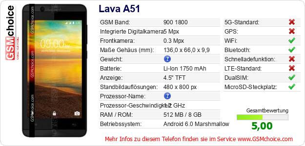 Hast du eigene Webseite? Willst du die Informationen über Standarddaten des Handys Lava A51 irgendwo veröffentlichen? Das ist sehr einfach. Du kannst das Bild herunterladen oder kopieren und auf der Webseite folgenden Code hinzufügen:Das Einfügen von diesem Code verursacht das Anzeigen von dem folgenden Bild: