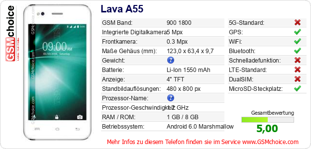 Hast du eigene Webseite? Willst du die Informationen über Standarddaten des Handys Lava A55 irgendwo veröffentlichen? Das ist sehr einfach. Du kannst das Bild herunterladen oder kopieren und auf der Webseite folgenden Code hinzufügen:Das Einfügen von diesem Code verursacht das Anzeigen von dem folgenden Bild: