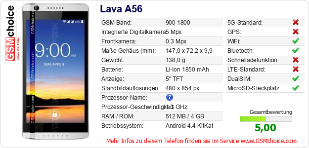 Hast du eigene Webseite? Willst du die Informationen über Standarddaten des Handys Lava A56 irgendwo veröffentlichen? Das ist sehr einfach. Du kannst das Bild herunterladen oder kopieren und auf der Webseite folgenden Code hinzufügen:Das Einfügen von diesem Code verursacht das Anzeigen von dem folgenden Bild:
