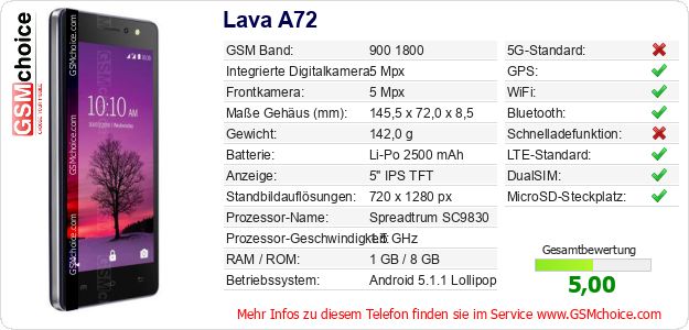 Hast du eigene Webseite? Willst du die Informationen über Standarddaten des Handys Lava A72 irgendwo veröffentlichen? Das ist sehr einfach. Du kannst das Bild herunterladen oder kopieren und auf der Webseite folgenden Code hinzufügen:Das Einfügen von diesem Code verursacht das Anzeigen von dem folgenden Bild: