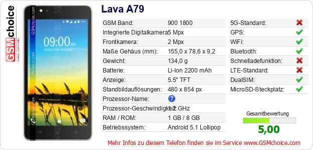 Hast du eigene Webseite? Willst du die Informationen über Standarddaten des Handys Lava A79 irgendwo veröffentlichen? Das ist sehr einfach. Du kannst das Bild herunterladen oder kopieren und auf der Webseite folgenden Code hinzufügen:Das Einfügen von diesem Code verursacht das Anzeigen von dem folgenden Bild: