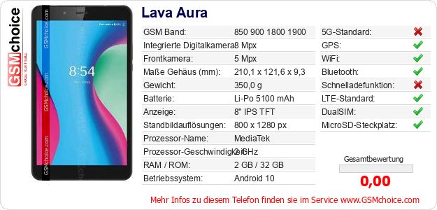 Hast du eigene Webseite? Willst du die Informationen über Standarddaten des Handys Lava Aura irgendwo veröffentlichen? Das ist sehr einfach. Du kannst das Bild herunterladen oder kopieren und auf der Webseite folgenden Code hinzufügen:Das Einfügen von diesem Code verursacht das Anzeigen von dem folgenden Bild: