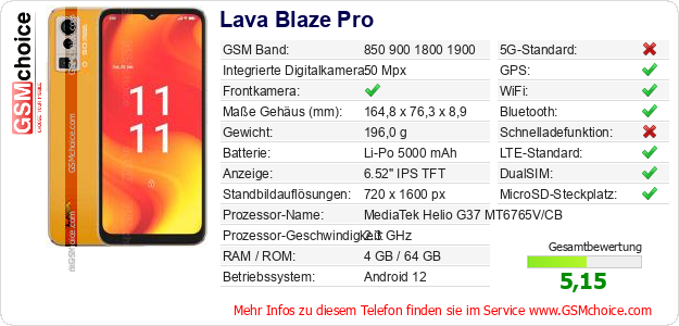 Hast du eigene Webseite? Willst du die Informationen über Standarddaten des Handys Lava Blaze Pro irgendwo veröffentlichen? Das ist sehr einfach. Du kannst das Bild herunterladen oder kopieren und auf der Webseite folgenden Code hinzufügen:Das Einfügen von diesem Code verursacht das Anzeigen von dem folgenden Bild: