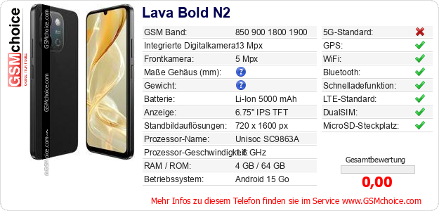 Hast du eigene Webseite? Willst du die Informationen über Standarddaten des Handys Lava Bold N2 irgendwo veröffentlichen? Das ist sehr einfach. Du kannst das Bild herunterladen oder kopieren und auf der Webseite folgenden Code hinzufügen:Das Einfügen von diesem Code verursacht das Anzeigen von dem folgenden Bild: