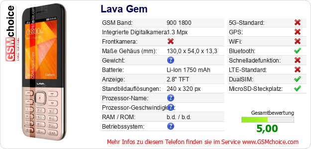 Hast du eigene Webseite? Willst du die Informationen über Standarddaten des Handys Lava Gem irgendwo veröffentlichen? Das ist sehr einfach. Du kannst das Bild herunterladen oder kopieren und auf der Webseite folgenden Code hinzufügen:Das Einfügen von diesem Code verursacht das Anzeigen von dem folgenden Bild: