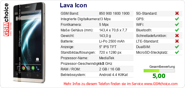 Hast du eigene Webseite? Willst du die Informationen über Standarddaten des Handys Lava Icon irgendwo veröffentlichen? Das ist sehr einfach. Du kannst das Bild herunterladen oder kopieren und auf der Webseite folgenden Code hinzufügen:Das Einfügen von diesem Code verursacht das Anzeigen von dem folgenden Bild: