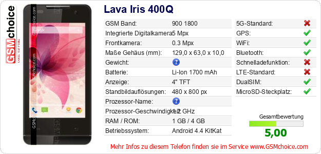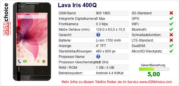 Hast du eigene Webseite? Willst du die Informationen über Standarddaten des Handys Lava Iris 400Q irgendwo veröffentlichen? Das ist sehr einfach. Du kannst das Bild herunterladen oder kopieren und auf der Webseite folgenden Code hinzufügen:Das Einfügen von diesem Code verursacht das Anzeigen von dem folgenden Bild:
