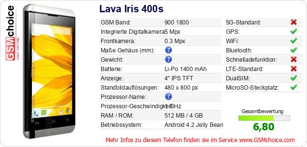 Hast du eigene Webseite? Willst du die Informationen über Standarddaten des Handys Lava Iris 400s irgendwo veröffentlichen? Das ist sehr einfach. Du kannst das Bild herunterladen oder kopieren und auf der Webseite folgenden Code hinzufügen:Das Einfügen von diesem Code verursacht das Anzeigen von dem folgenden Bild: