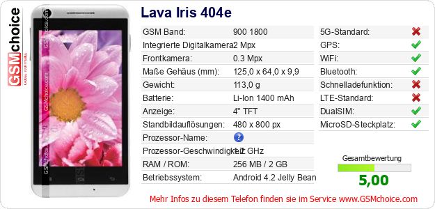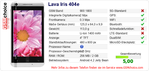 Hast du eigene Webseite? Willst du die Informationen über Standarddaten des Handys Lava Iris 404e irgendwo veröffentlichen? Das ist sehr einfach. Du kannst das Bild herunterladen oder kopieren und auf der Webseite folgenden Code hinzufügen:Das Einfügen von diesem Code verursacht das Anzeigen von dem folgenden Bild: